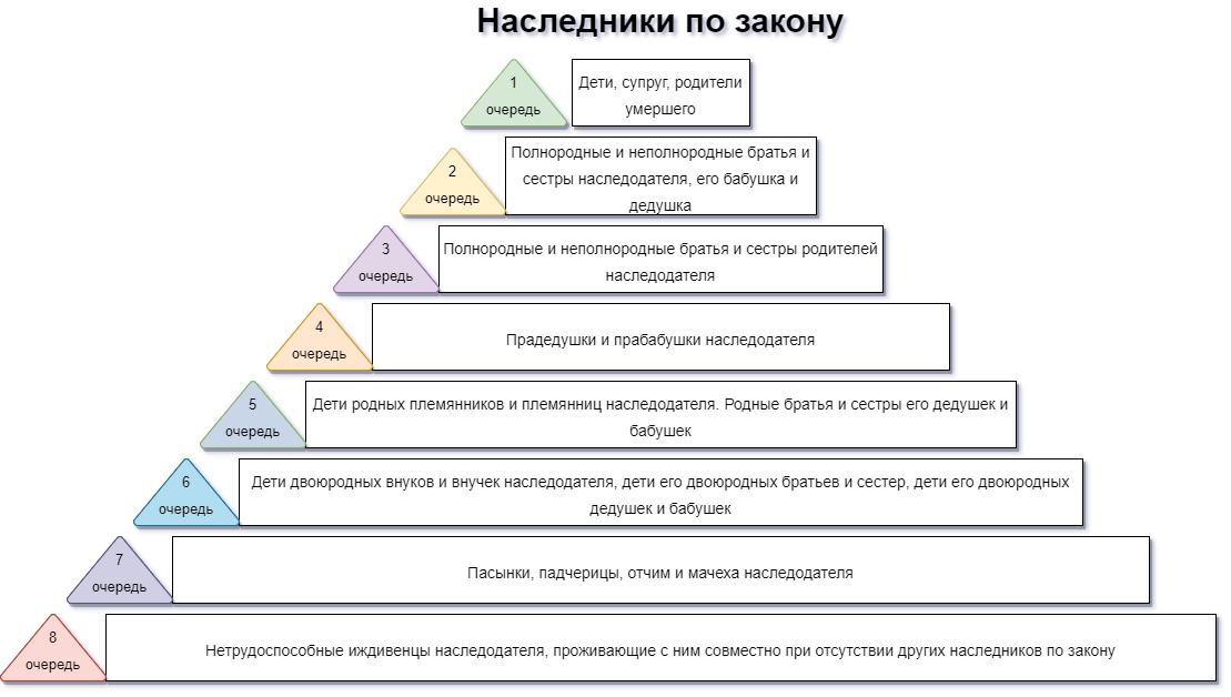 По закону‚ первую очередь наследования составляют супруг или супруга наследодателя‚ дети‚ внуки и праправнуки наследодателя‚ а также родители наследодателя. Вторую очередь наследования образуют братья и сестры наследодателя‚ их дети (племянники и племянницы)‚ дедушка и бабушка наследодателя‚ их дети (дяди и тети) и их дети (двоюродные братья и сестры).